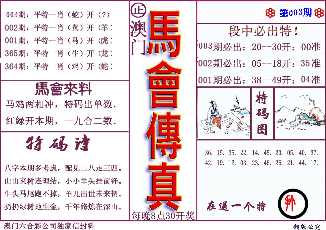 003期会传真:〖开?00〗 马鸡两相冲,特码出单数,红緑开本期,一九合二数。 解析:诗句解马鸡蛇龙 综合特肖:马牛龙猴鸡羊蛇虎 综合六肖:马牛龙猴鸡羊 主推特码:24 48 05 17 14 38 22 34 21 45 |
